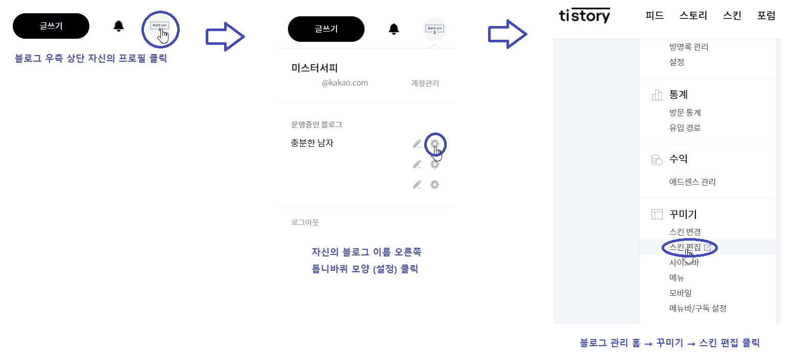 여기에서 꾸미기 탭 아래 있는 '스킨 편집'을 누릅니다.