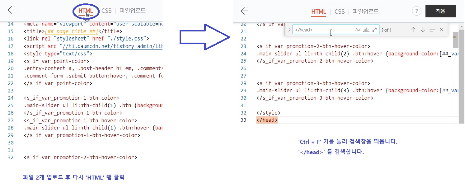 검색창에서 '</head>' 를 입력해 해당 코드를 찾아줍니다.