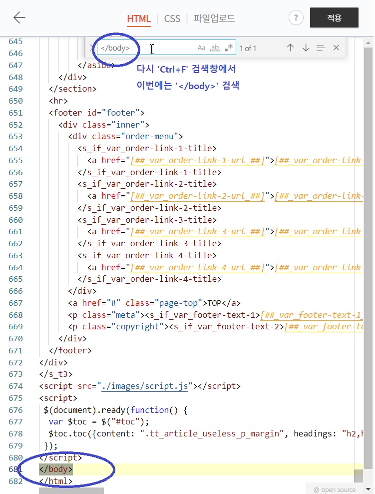 코드 복사, 붙여넣기가 완료되셨으면 이번엔 'Ctrl + F' 검색창에서</body> 를 검색해봅니다.