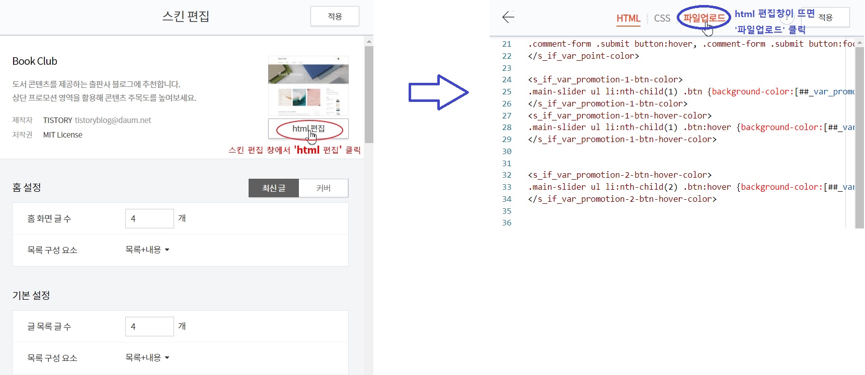 스킨 편집 창에서 'html 편집'을 클릭한 후, HTML 편집창이 뜨면 '파일 업로드' 탭을 클릭합니다.