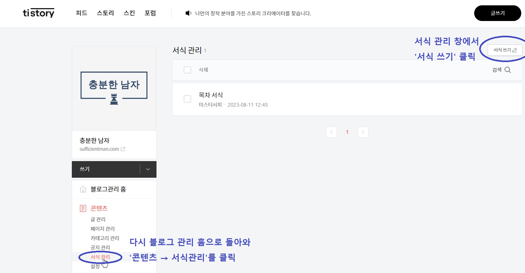 다시 블로그 관리 홈으로 돌아오셔서 '콘텐츠' 탭 아래의 '서식 관리'를 클릭해주세요.