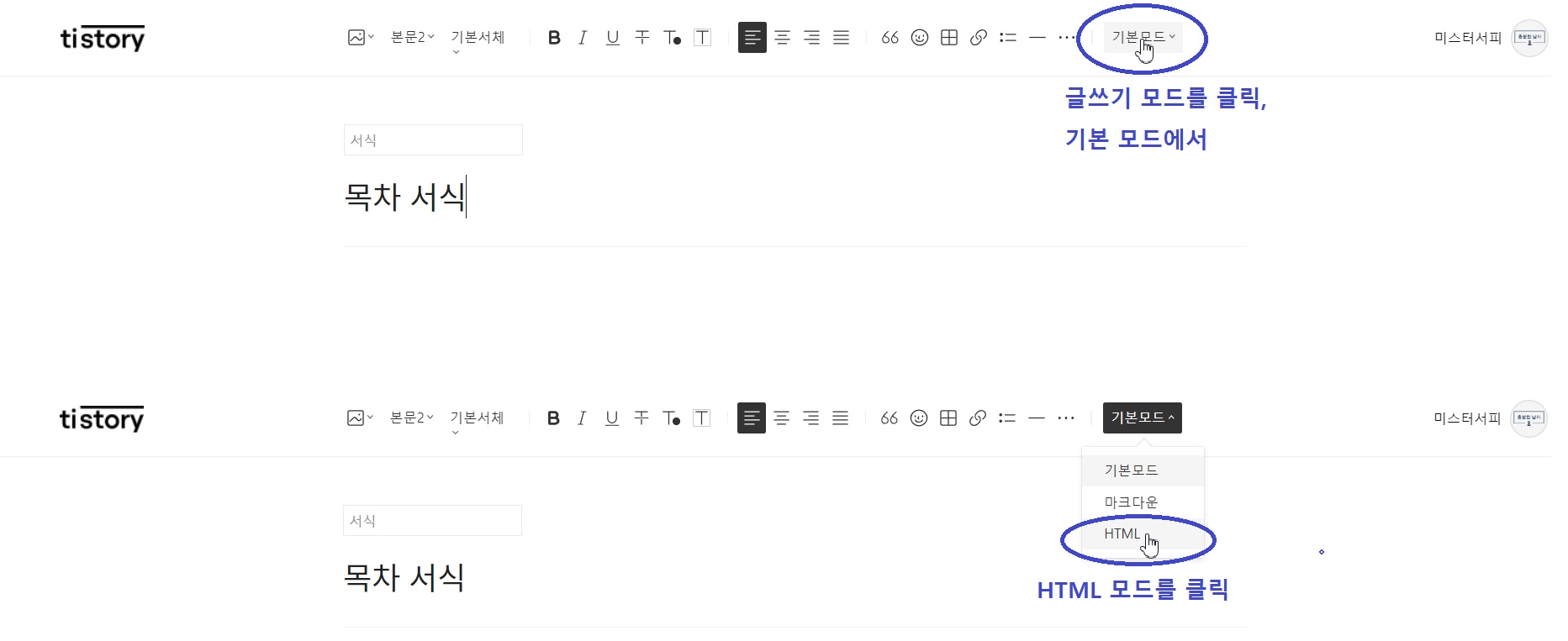 우측 상단의 글쓰기 '기본모드' 를 클릭해서 'HTML' 모드로 바꿔주세요.