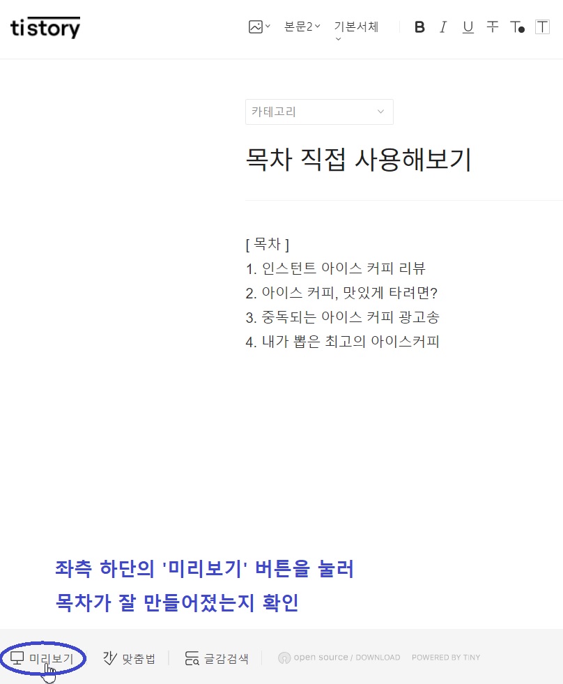 목차 작성이 완료되셨다면 미리보기를 클릭하셔서 목차 작성이 잘 되었는지 확인해봅니다.