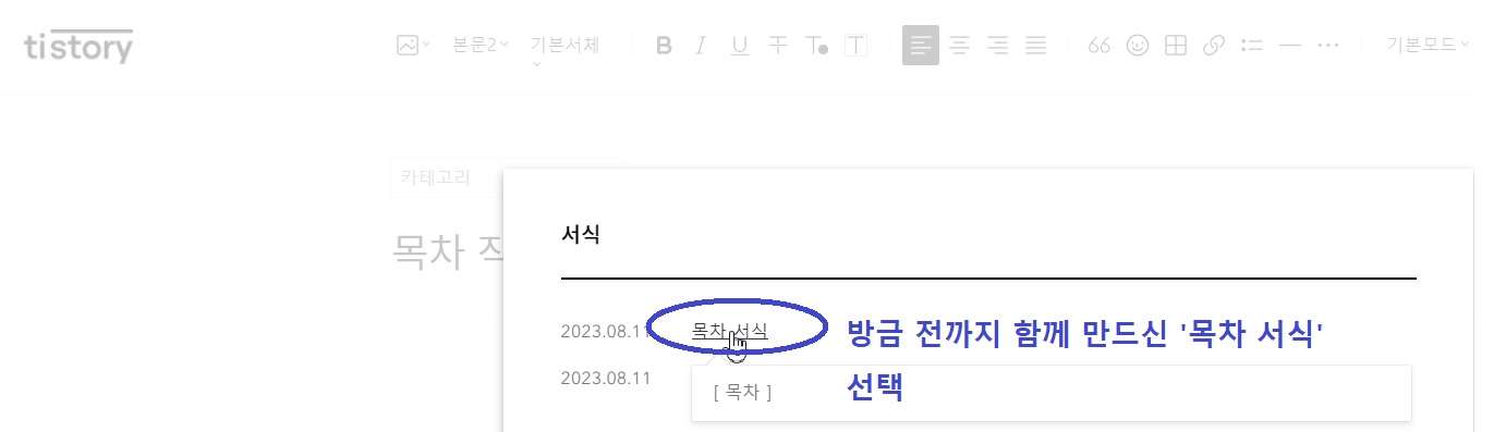 서식 메뉴가 열렸으면 방금까지 함께 만드셨던 '목차 서식'을 불러옵니다.