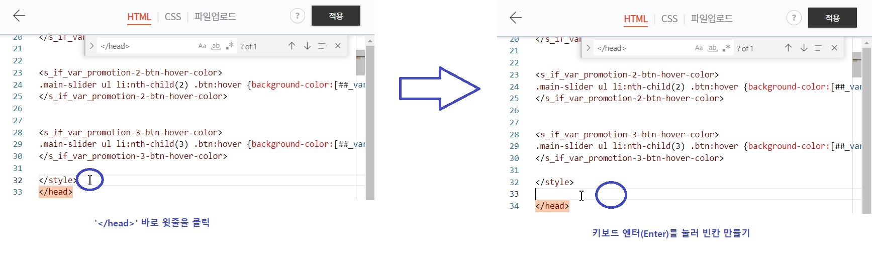 </head>를 찾으셨으면 바로 윗 줄을 클릭하신 후 키보드 엔터를 눌러주시면 빈칸이 생성됩니다.