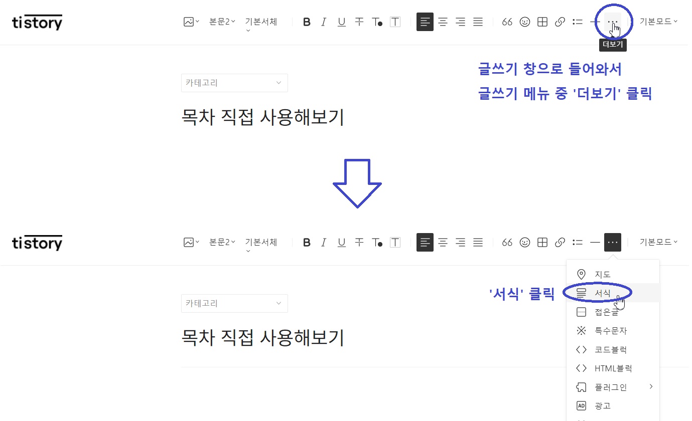 글쓰기 창에 들어오셔서 글을 작성하실 때, 글쓰기 메뉴 중 '더보기' 를 클릭해서 '서식' 메뉴를 불러와주세요.
