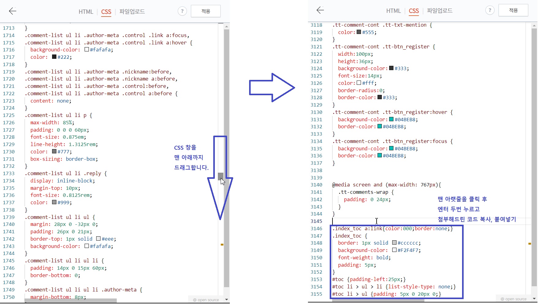 CSS 관리 창이 뜨면 맨 아래로 드래그해서 맨 아랫줄을 클릭한 후, 엔터 두 번을 눌러주세요.