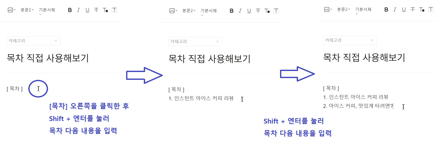 Shift + 엔터, 혹은 그냥 엔터를 눌러 원하시는 목차 문구를 한 줄 한 줄 작성해주시면 됩니다.