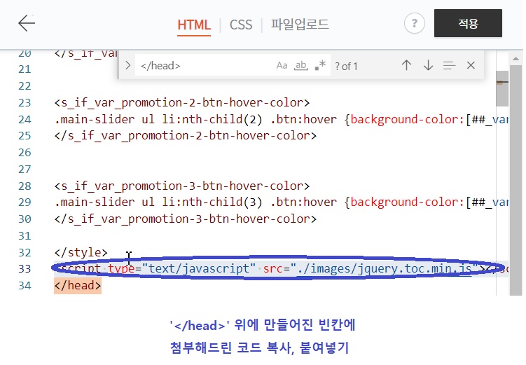 검색창에서 '</head>' 를 입력해 해당 코드를 찾아줍니다.