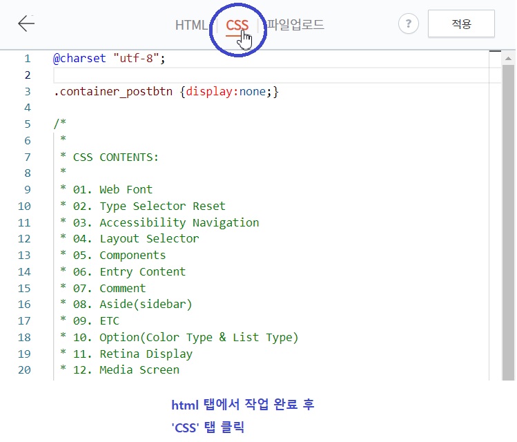 HTML 코드 입력이 완료되셨다면 CSS 탭을 클릭해주세요.